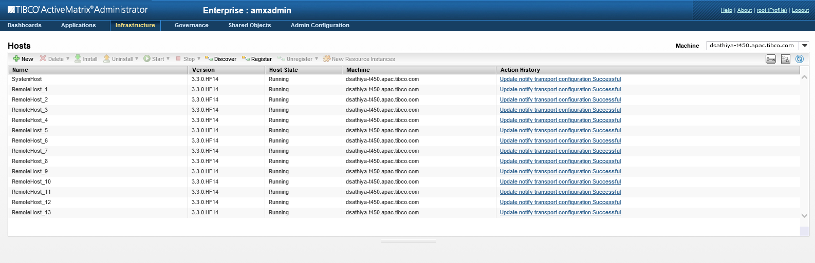 C:\tibco\installation_homes\amx330ga\dataV228\admin\amxadmin\samples>ant -f qin_build.xml setNotifyConfig Buildfile: C:\tibco\installation_homes\amx330ga\dataV228\admin\amxadmin\samples\qin_build.xml -test.targets.order: [echo] Invoked targets: setNotifyConfig [echo] Specified Ant targets are in order hence proceeding with Notification Transport Update. setNotifyConfig: [AMXAdminTask] 29 Sep 2016 20:35:26 INFO - TIBCO-AMX-HPA-050281: This action is tracked in logs by operationID: 'root_NotificationTransportUpdate_20160929203524' [AMXAdminTask] 29 Sep 2016 20:35:26 INFO - TIBCO-AMX-HPA-050264: Notification Transport will be updated on below hosts: [AMXAdminTask] 29 Sep 2016 20:35:26 INFO - ------------------------------------------------------------------------------------------- [AMXAdminTask] 29 Sep 2016 20:35:26 INFO - RemoteHost_1 [AMXAdminTask] 29 Sep 2016 20:35:26 INFO - RemoteHost_2 [AMXAdminTask] 29 Sep 2016 20:35:26 INFO - RemoteHost_3 [AMXAdminTask] 29 Sep 2016 20:35:26 INFO - RemoteHost_4 [AMXAdminTask] 29 Sep 2016 20:35:26 INFO - RemoteHost_5 [AMXAdminTask] 29 Sep 2016 20:35:26 INFO - RemoteHost_6 [AMXAdminTask] 29 Sep 2016 20:35:26 INFO - RemoteHost_7 [AMXAdminTask] 29 Sep 2016 20:35:26 INFO - RemoteHost_8 [AMXAdminTask] 29 Sep 2016 20:35:26 INFO - RemoteHost_9 [AMXAdminTask] 29 Sep 2016 20:35:26 INFO - RemoteHost_10 [AMXAdminTask] 29 Sep 2016 20:35:26 INFO - RemoteHost_11 [AMXAdminTask] 29 Sep 2016 20:35:26 INFO - RemoteHost_12 [AMXAdminTask] 29 Sep 2016 20:35:26 INFO - RemoteHost_13 [AMXAdminTask] 29 Sep 2016 20:35:26 INFO - SystemHost [AMXAdminTask] 29 Sep 2016 20:35:26 INFO - ------------------------------------------------------------------------------------------- [AMXAdminTask] 29 Sep 2016 20:35:26 INFO - TIBCO-AMX-HPA-050266: Waiting to complete Notification Transport Update on Host: 'SystemHost' [AMXAdminTask] 29 Sep 2016 20:35:26 INFO - TIBCO-AMX-HPA-050269: Starting Notification Transport Update for host: 'SystemHost' [AMXAdminTask] 29 Sep 2016 20:35:29 INFO - TIBCO-AMX-ADMIN-026016: Notification Transport Configuration will be updated in the background on host SystemHost [AMXAdminTask] 29 Sep 2016 20:35:34 INFO - TIBCO-AMX-HPA-050279: Notification Transport Update is completed for Host: 'SystemHost' [AMXAdminTask] 29 Sep 2016 20:35:34 INFO - TIBCO-AMX-HPA-050282: Notification Transport Update completed for '1' out of '14' hosts. [AMXAdminTask] 29 Sep 2016 20:35:36 INFO - TIBCO-AMX-HPA-050269: Starting Notification Transport Update for host: 'RemoteHost_13' [AMXAdminTask] 29 Sep 2016 20:35:36 INFO - TIBCO-AMX-HPA-050269: Starting Notification Transport Update for host: 'RemoteHost_12' [AMXAdminTask] 29 Sep 2016 20:35:36 INFO - TIBCO-AMX-ADMIN-026016: Notification Transport Configuration will be updated in the background on host RemoteHost_13 ... ... [AMXAdminTask] 29 Sep 2016 20:35:52 INFO - TIBCO-AMX-HPA-050282: Notification Transport Update completed for '12' out of '14' hosts. [AMXAdminTask] 29 Sep 2016 20:35:52 INFO - TIBCO-AMX-HPA-050279: Notification Transport Update is completed for Host: 'RemoteHost_2' [AMXAdminTask] 29 Sep 2016 20:35:52 INFO - TIBCO-AMX-HPA-050282: Notification Transport Update completed for '13' out of '14' hosts. [AMXAdminTask] 29 Sep 2016 20:35:52 INFO - TIBCO-AMX-HPA-050279: Notification Transport Update is completed for Host: 'RemoteHost_1' [AMXAdminTask] 29 Sep 2016 20:35:52 INFO - TIBCO-AMX-HPA-050282: Notification Transport Update completed for '14' out of '14' hosts. [AMXAdminTask] 29 Sep 2016 20:35:57 INFO - Action finished at 9/29/16 8:35 PM in 32.359 seconds BUILD SUCCESSFUL Total time: 38 seconds C:\tibco\installation_homes\amx330ga\dataV228\admin\amxadmin\samples>The TIBCO ActiveMatrix Administrator GUI shows Action History as "Update notify transport configuration Successful" for all Hosts, as shown below in the Hosts view of the Enterprise.