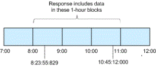 The operation response will include the measures (times or counts) stored in the one-hour blocks after the date/time is rounded. For example:
