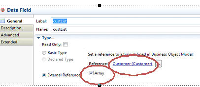 Let us consider a process data field that holds a List of Customer objects called custList. The properties sheet for custList has Array selected and is of type Customer: