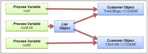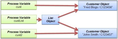 First, a new Customer instance has not been created for Clint Hill, so the first two lines above, modify the John Smith Customer instance to refer to Clint Hill. Then when the add() method is called for the third time, it attempts to add a second reference to the same Customer instance. However, this add fails because the List type used does not allow the same object to be included more than once. So the list ends up containing the Fred Blogs and Clint Hill Customer instances but not John Smith:
