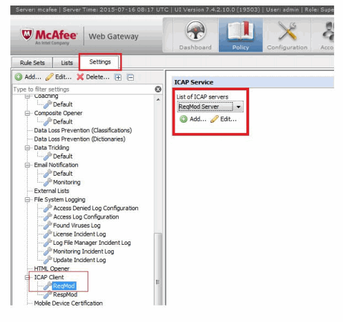 Use McAfee Web Console to configure ICAP client and servers.
