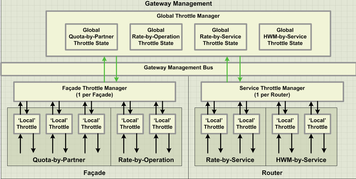 The Global Throttle Manager manages the Façade Throttle Manager and Service Throttle Manager. The Global Throttle Manager reports throttle usage to the Central Logger.