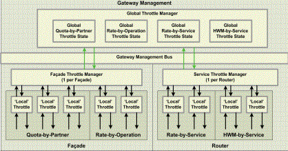 The Global Throttle Manager component maintains the state of all the global throttles in both Facades (Facade Throttles) and Routers (Service Throttles). The Global Throttle Manager exchanges the states of global throttles with active Facade Throttle Managers and Service Throttle Managers.