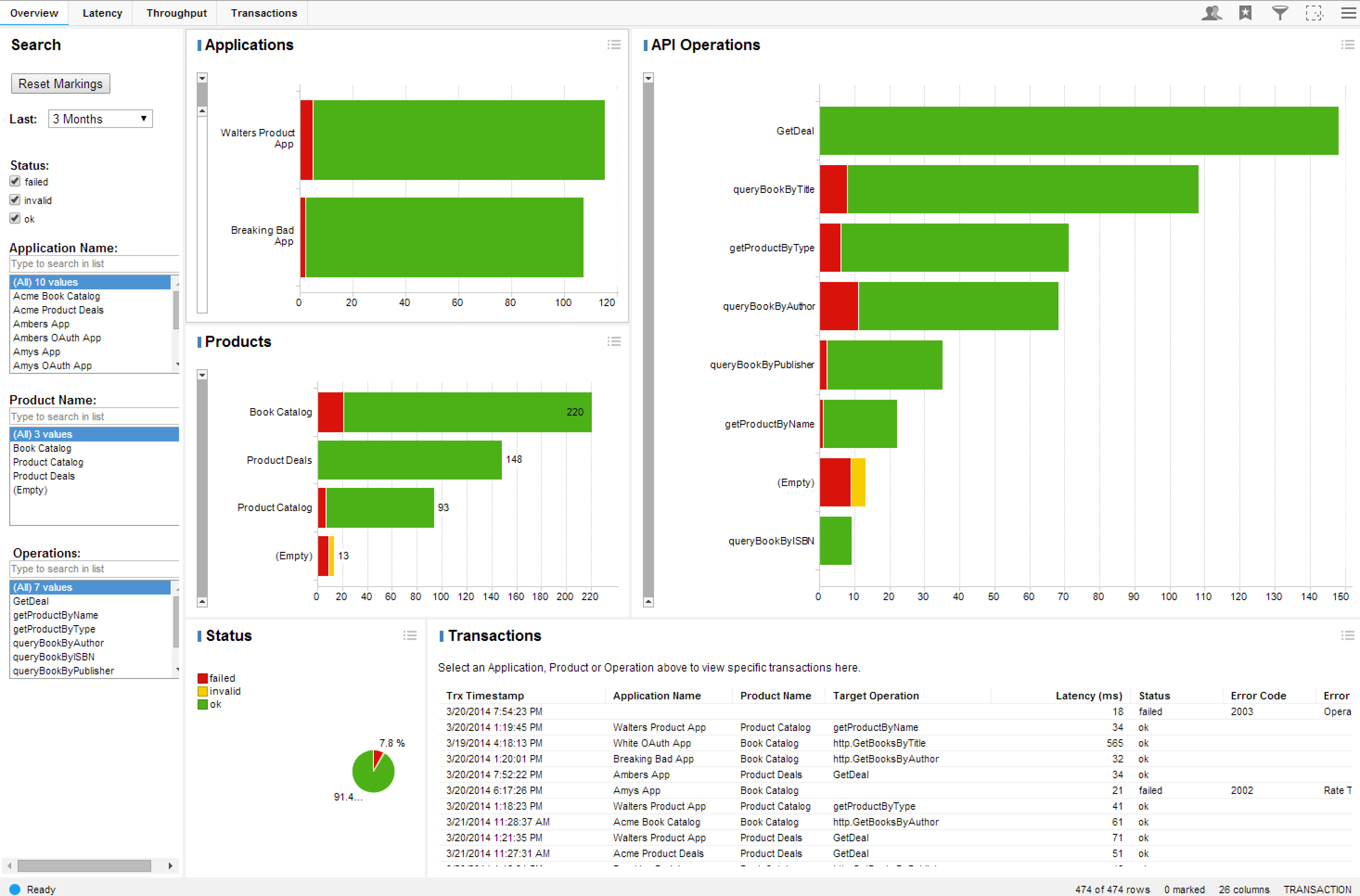Users can select the statistics dashboard to view detailed usage and performance statistics by application, by products or by operation. The user can view latency, throughput, and transactions statistics for all applications or for a specified application. The following figure shows the Overview Statistics Dashboard.