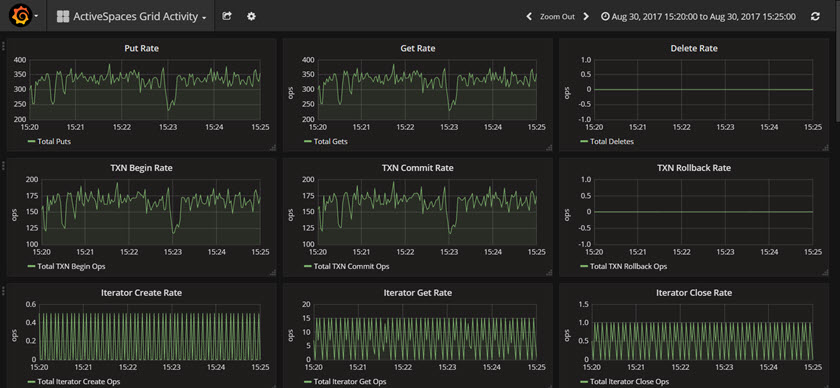 The following is an example of the ActiveSpaces Grid Activity dashboard when the grid is actively handling put activities, get activities, etc.
