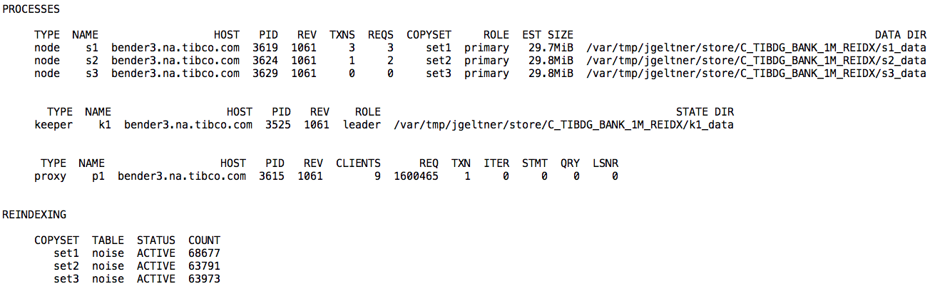 The PROCESSES section displays the status of the tibdgnode, tibdgkeeper, and tibdgproxy processes.