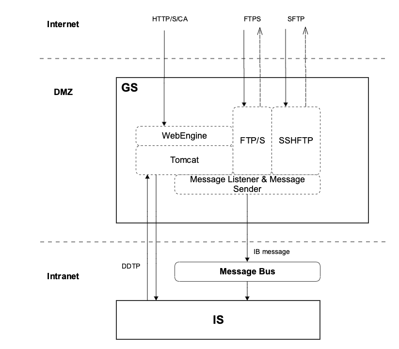 Gateway Server (GS) is located in the demilitarized zone and functions as the front gate by receiving the inbound transactions from trading partners. Multiple Gateway Servers can work together for load balancing.