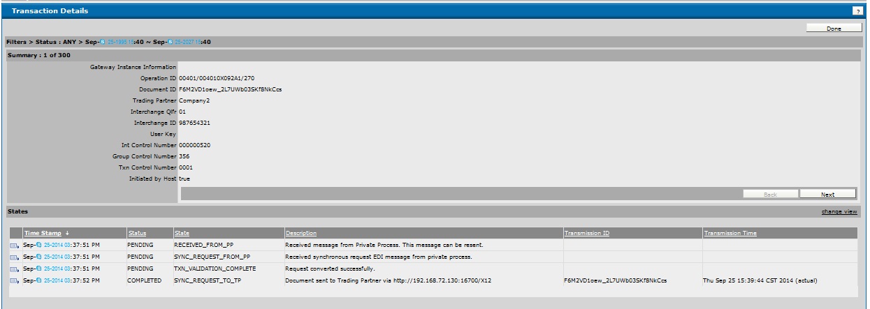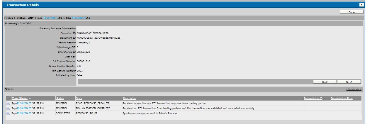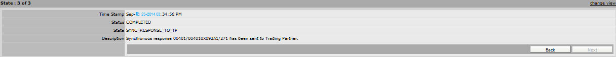 5. Click on the Details icon next to the completed transaction SYNC_RESPONSE_TO_TP.Figure 15 contains a transaction detail example for the 271 response returned to the initiator.Figure 15 Responder: SYNC_RESPONSE_TO_TP