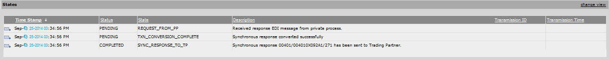 7. Click on the Details icon next to the completed transaction SYNC_REQUEST_TO_TP. The Initiator response detail appears.Figure 19 SYNC_REQUEST_TO_TPFigure 19 contains a transaction detail example for a successfully completed 270 request.