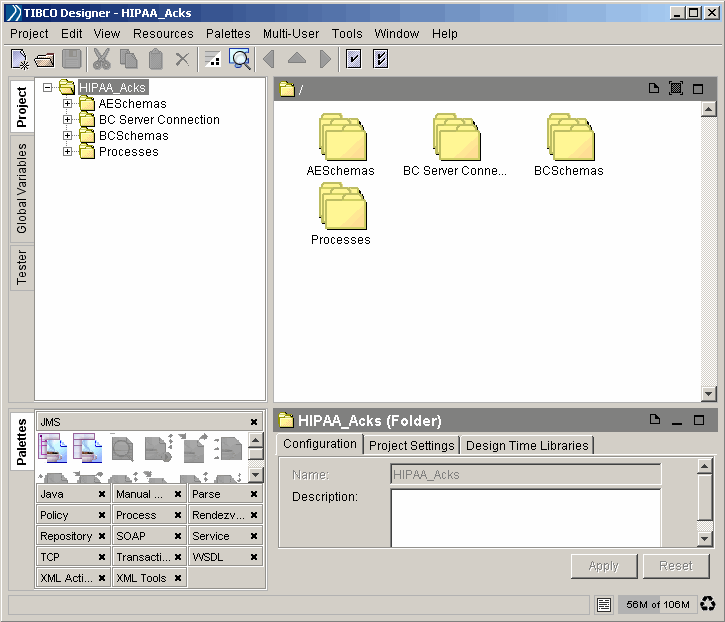 14. Click Yes when a dialog appears asking to use the directory as a project directory. The zip archive file will be deleted. The following window is displayed.Figure 21 TIBCO BusinessWorks Project