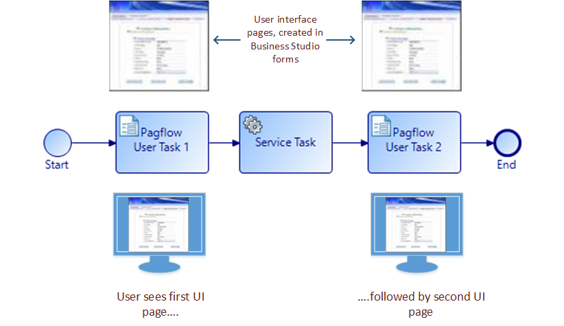 For example, in this diagram, the user is presented with the user interface page (in this case a form created using TIBCO Business Studio - BPM Edition Forms) associated with pageflow user task one.