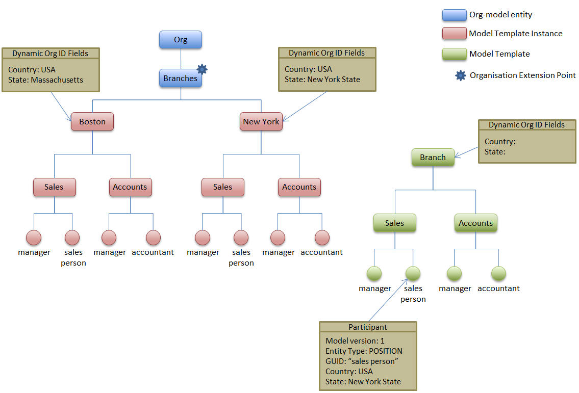 As an example; the figure below shows an Organization Model with a Dynamic Organization Model, the root node of which is named Branch. Branches is the name of the extension point. There are two Dynamic Organization Model instances, named Boston, and New York. A Dynamic Organization Participant references the sales person Position within the Dynamic Organization Model (the GUID would actually be a generated value, but the name has been used here for clarity).