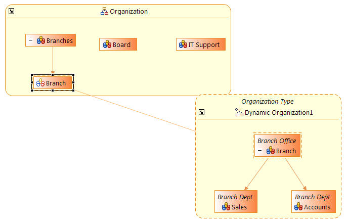 In the example below, the dynamic organization unit Branch has a reference to the Dynamic Organization called Dynamic Organization1. Dynamic Organization1 consists of a hierarchy of organization units which make up a branch structure.
