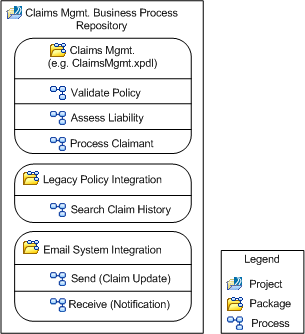 The following example shows a project and the associated packages and processes used in an insurance environment.