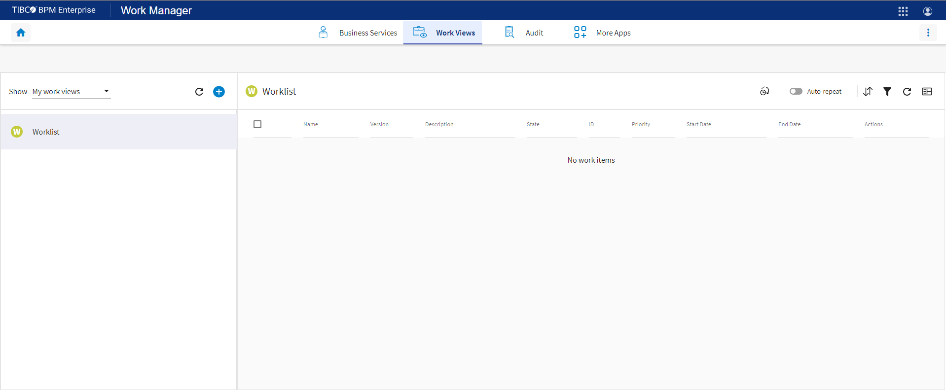 - Work List - displays all the work items that you can work on. See Work Items for more information.