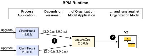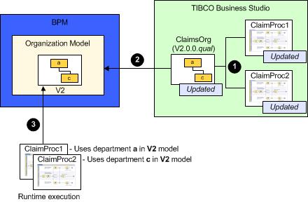 (4) Updates ClaimProc1 so that ClaimsOrg’s updated major version number (2) is reflected (internally in the process definition) in its participant references to department a.