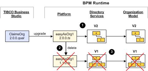 (3) Directory Services deletes the deployment artifact from the 1.1.0.ts version of the easyAsOrg1 application. As there are no longer any deployment artifacts contributing to the V1 organization model, it is deleted.