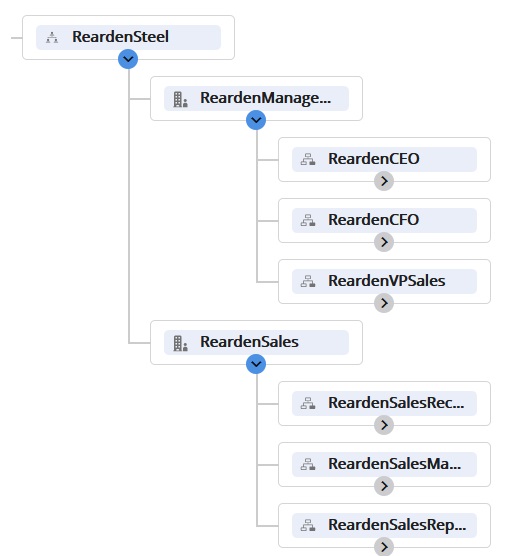 Positions are subordinate to an organization unit in the organization model. An organization unit can have many positions. Positions cannot be nested, although organization units can. In the following example, ReardenManagement and ReardenSales are organization units under the ReardenSteel organization. Each of the organizational unit has three positions.