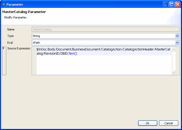 Double-click on the parameter and select XPath from the Eval drop-down list. Use the Source Expression to write the xpath expression.