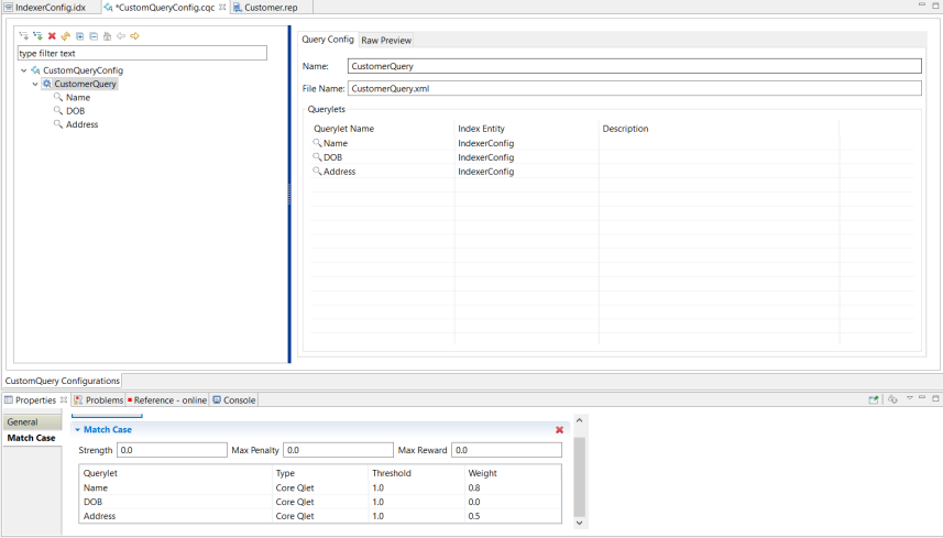 - In the CustomeQueryConfig.cqc panel, expand the CustomQueryConfig and select a Query Config where you want to add Match Cases.