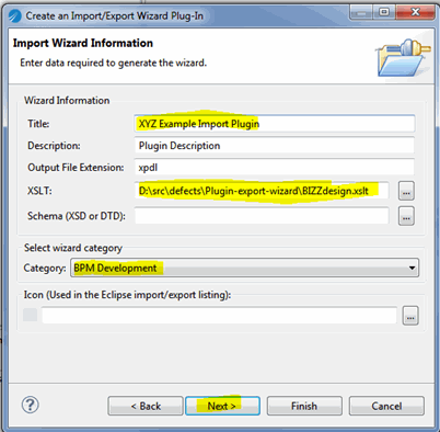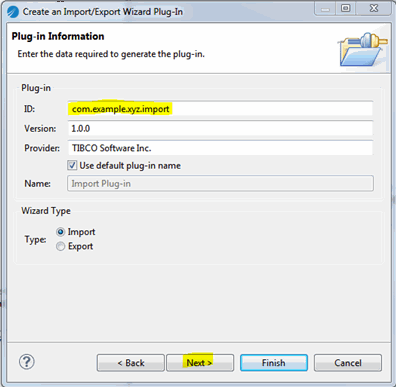 - Fill in the details on the Plug-in Information page (com.example.xyz.import in the example below) and click Next.