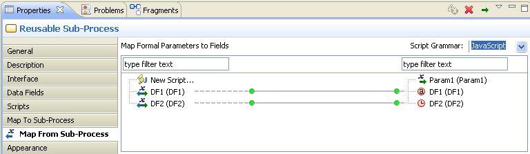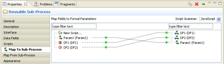 - A mapping is created between data fields and formal parameters of the sub-process and any corresponding formal parameters that are created in the sub-process. You can view this mapping by selecting the task that calls the sub-process and clicking the Map To Sub-Process and Map From Sub-Process tabs in the Properties view.
