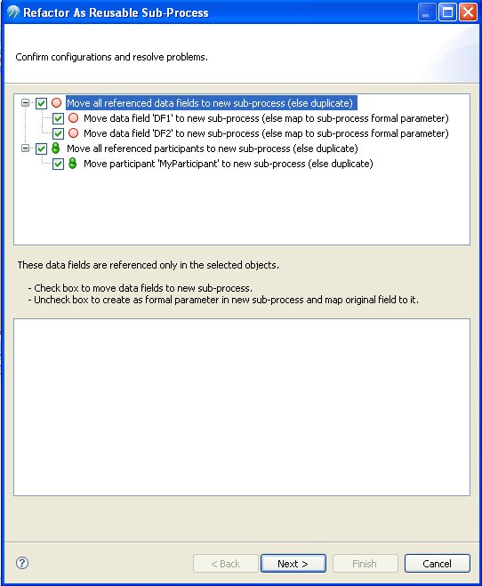 - If a data field is referenced only in the selection that you are refactoring, you have the option of moving or copying it. Data fields that are copied into the sub-process are created as formal parameters and mapped. Data fields that are moved into the sub-process are created as data fields. By default, data fields are moved. In order to copy them as formal parameters, you must uncheck the selection boxes on the dialog.