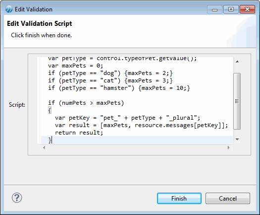 Note: The script editor provides content-assist editing. On typing the beginning of a legal value, such as “control.”, a pop-up window appears listing the available completion proposals. If you type