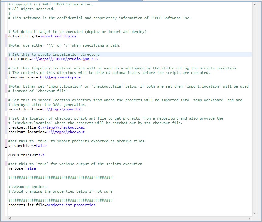 - Edit the run.properties file to specify the configuration properties for the build.xml file.