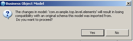 In addition to creating UML elements in the Business Object Model, the original XSD information is also stored internally as stereotypes defined within a custom UML profile. This information is used if the Business Object Model originating from an XML schema import is re-exported as XSD so that the exported schema can be reconstructed to be logically equivalent to the original without loss of information (see Export Mappings). Note however, that this information exists only until the user makes a change to the model of the newly created Business Object Model. At this point the user will be presented with the following dialog: