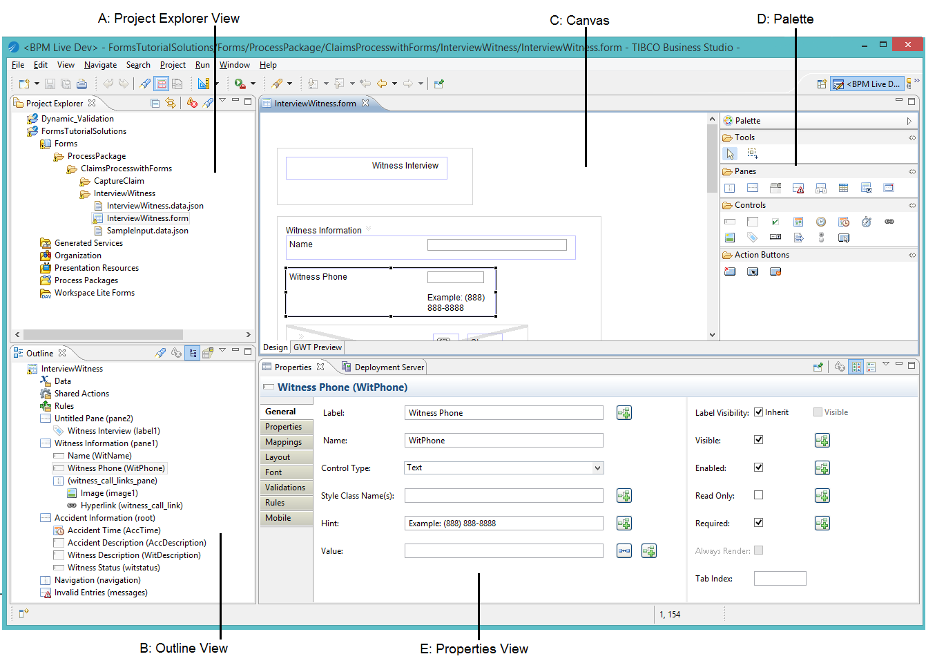 The Eclipse workbench for modeling forms appears by default when TIBCO Business Studio is installed. The BPM Modeling perspective provided by TIBCO Business Studio includes certain views and editors that are important for designing and deploying forms.