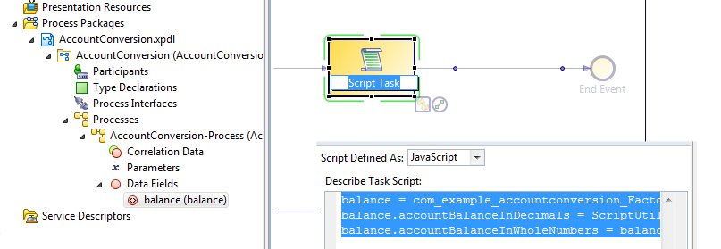 In the process, a data field balance is defined as an external reference to the BOM class Balance. The field is used in a script task, as shown in the following illustration.