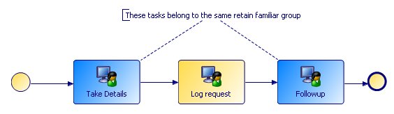 Note: This pattern specifies that you would ideally like tasks to be executed by the same resource. However, this is not always possible in the runtime environment. For example, it may be that by the time the later tasks in a retain familiar group are reached, the original participant is unavailable or not in the participant set. In such cases, the work item is delivered as normal according to the distribution strategy.