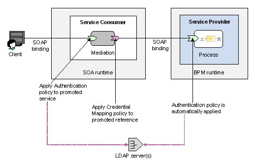 The Mediation application authenticates these credentials, which are automatically propagated to the service exposed by the BPM process across a SOAP binding. If the propagated credentials are also valid for the BPM process, access to the BPM service will be granted.