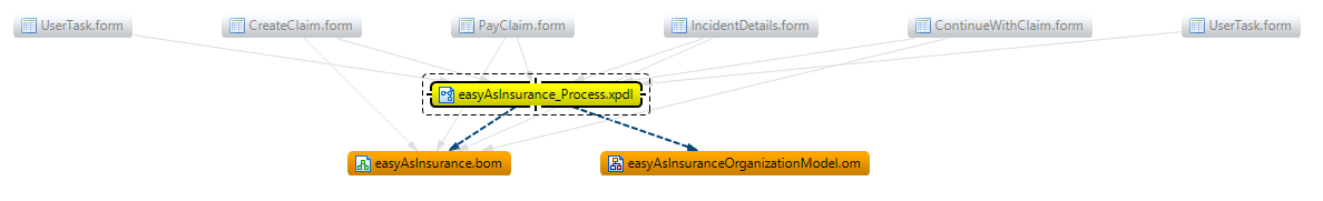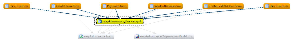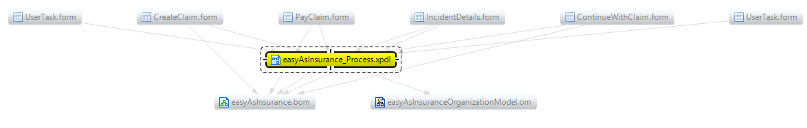 For example, right-clicking the easyAsInsurance_Process.xpdl file shows references from the form files to the XPDL file and references from the XPDL file to the easyAsInsurance.bom (business object model) and easyAsInsuranceOrganizationModel.om (organization model).