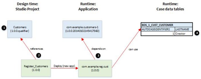 A process that references an element in a case data model has an application dependency on the exact version of the referenced case data model. It is important to understand the implications of this exact-match relationship, and to manage those implications when upgrading either a case data model or a dependent process. Not doing so could result in deployment errors or runtime issues.