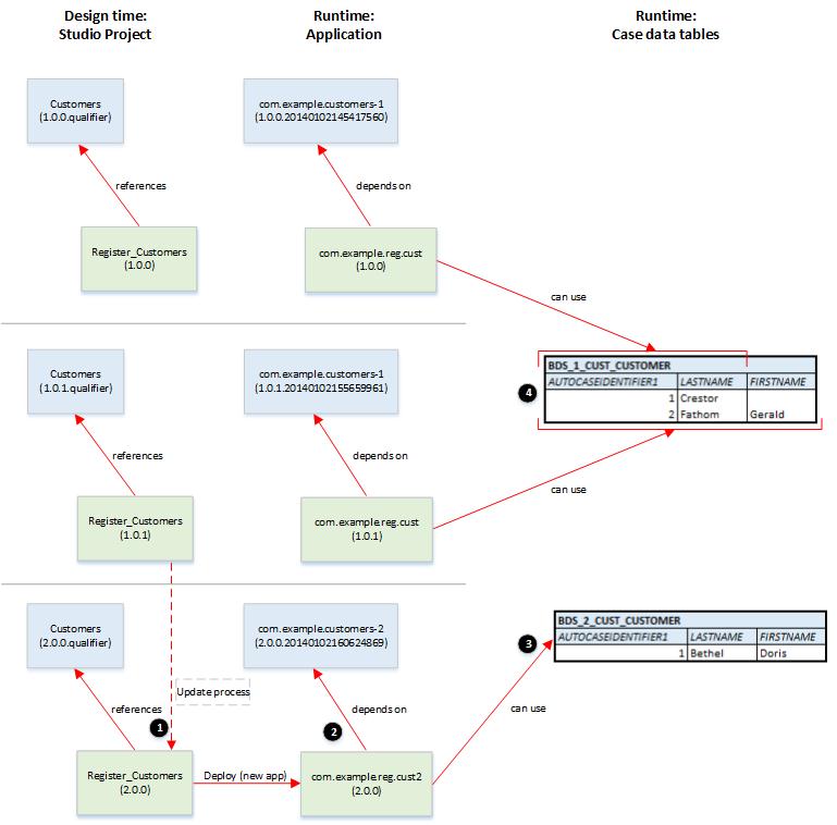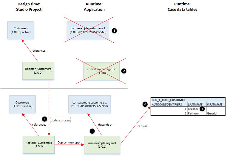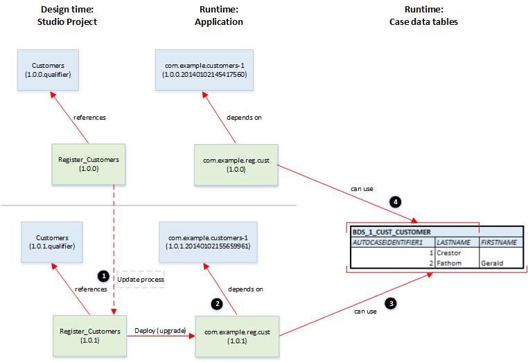 3. He deploys the process as an upgrade to the com.example.reg.cust application. This version of the application has a dependency on the upgraded version of the com.example.customers-1 business data application.