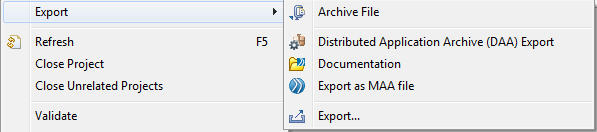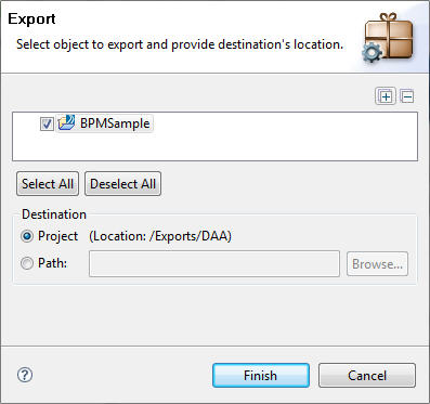 You can export a project to a Distributed Application Archive. This is a suitable method for situations where you do not have authorization to export directly to the BPM runtime; for example, in a production environment where developers cannot deploy directly to a production server but can deliver the project as a DAA archive to be uploaded by those responsible for the production machines.