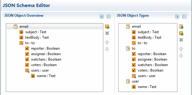 Each JSON schema contains a single root complex type (as displayed on the left hand side tree of the editor). Child properties can be added to this type (on left hand side or right hand side). New child complex types can be added to the right hand side tree.