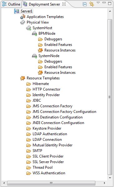 Expand the BPMEnvironment to see all the applications and nodes that are already deployed to the BPM Environment on the server. Expand the Applications to list the applications deployed to the server, including the target BPM application (by default amx.bpm.app). Expand the Nodes to list the nodes deployed to the server, including the BPMNode.