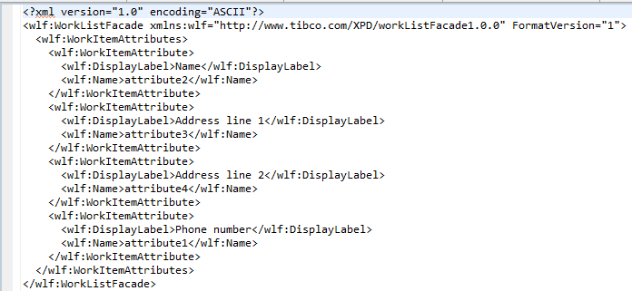The work list facade editor is a table editor that allows you to optionally set the display label for any of the predefined set of 40 work item attributes.