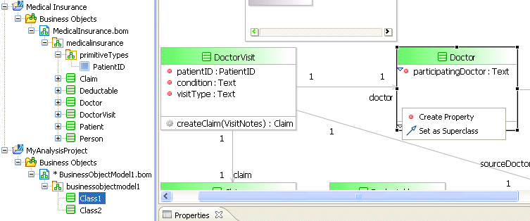 3. Drag the diagram node to the Business Object where you want to add or create a new object. A menu is displayed in the new model asking what you want to do with the new object. The menu that is displayed depends on the type of business object you have copied. An example is shown below: