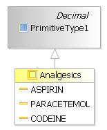 In the example below, a Primitive Type of the Decimal data type has been created. There is also an Enumeration called Analgesics, containing enumeration literals. You create a generalization from the Enumeration to the Primitive type. In this example, this would create an Analgesics enumeration with decimal literals.