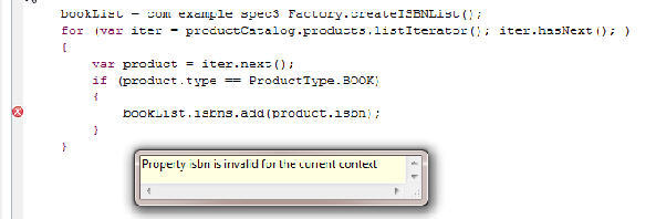 Similarly, in scripts, if you iterate through the products List, the Script Editor just gives you the content assist for the Product object. You will get an error if you attempt to access the isbn attribute of a Product Business Object, as shown below: