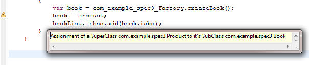 The TIBCO Business Studio Script Editor gives a warning about the assignment of a field that it thinks contains a Product to a field that it treats as holding a Book. However we know, from the test that we conducted previously, that in this case it is safe: