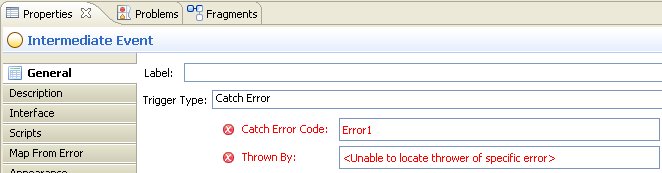 After configuring a catch error event, the event that throws the error code is deleted, invalidating the catch error event as shown in the Properties view.