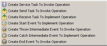 - Drag the operation to the point in your process flow where you want to expose the web service operation. A context-sensitive menu is displayed, listing the tasks and events you can use to expose the selected operation. For example: