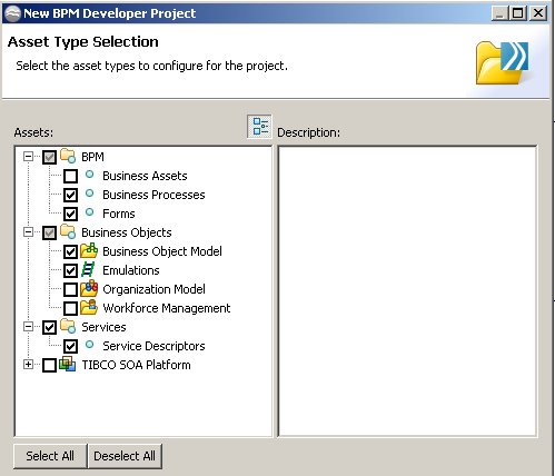 - The Asset Type Selection dialog displays the types of assets that you can include in your project.