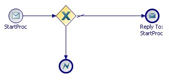The default sequence flow from the gateway replies to the start event. The conditional sequence flow from the gateway throws an error with the code WSDL error.