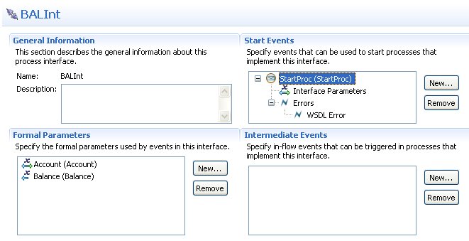 This process interface has a start event, an error code (WSDL error), and two parameters, Account and Balance.